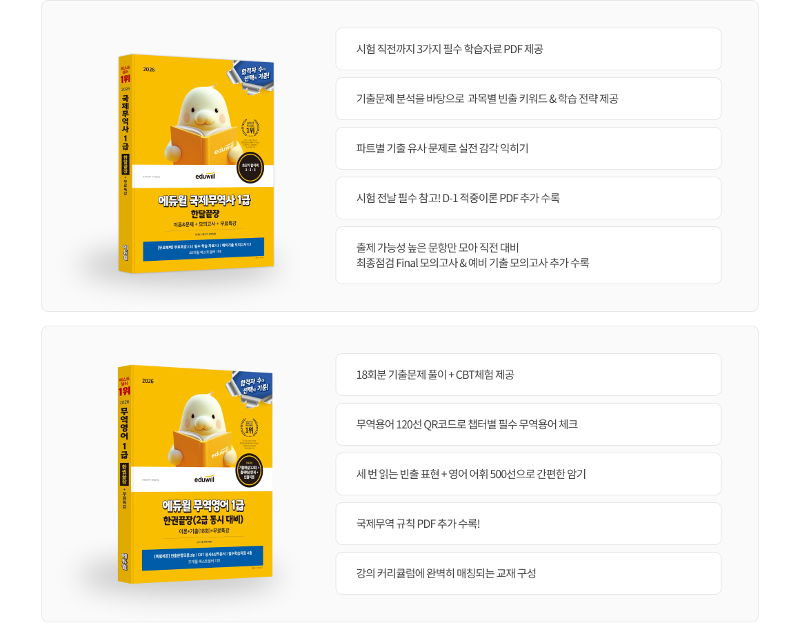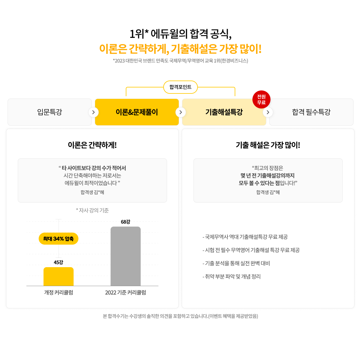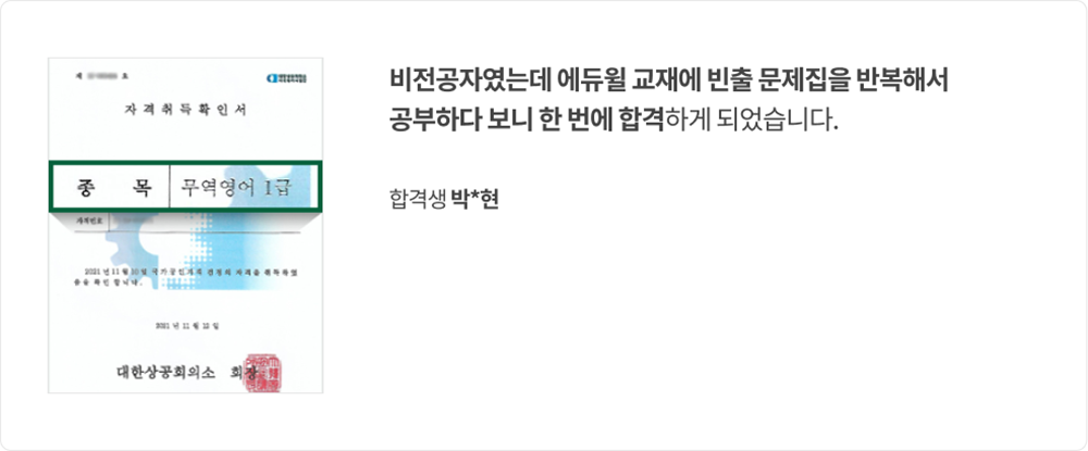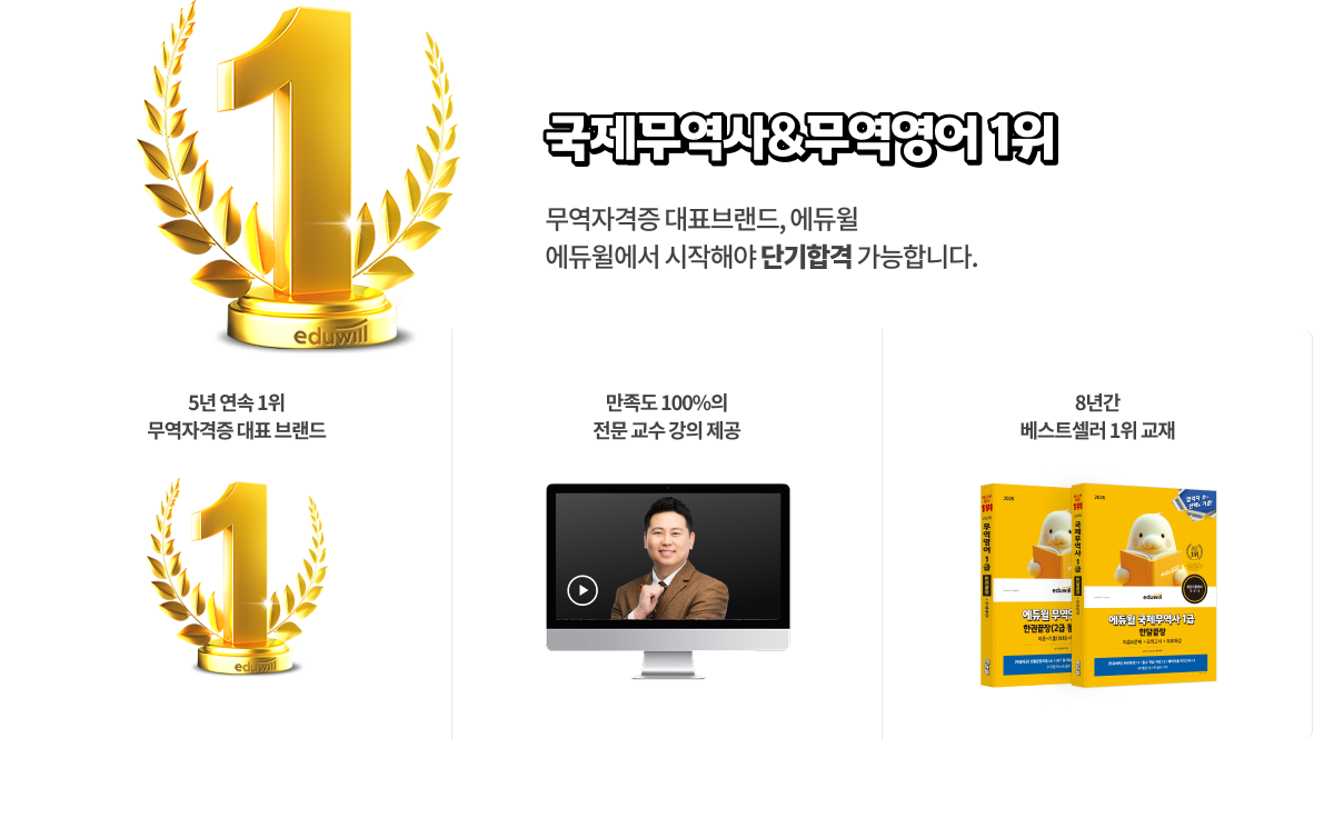 5년 연속 국제무역사/무역영어 1위의 위엄, 우연이 아닌 실력 에듀윌 국제무역사X무역영어 더블합격패스 * 2023/2022/2021 대한민국 브랜드 만족도(한경비즈니스), 2020/2019 한국브랜드 만족지수 국제무역사/무역영어 교육1위(주간동아,G밸리뉴스)