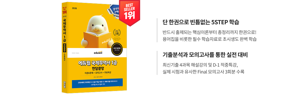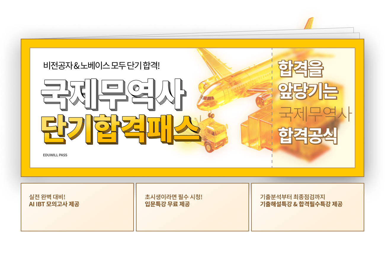 5년 연속 국제무역사 1위의 위엄, 우연이 아닌 실력 에듀윌 국제무역사 단기합격패스 * 2023/2022/2021 대한민국 브랜드 만족도(한경비즈니스), 2020/2019 한국브랜드 만족지수 국제무역사/무역영어 교육1위(주간동아,G밸리뉴스)