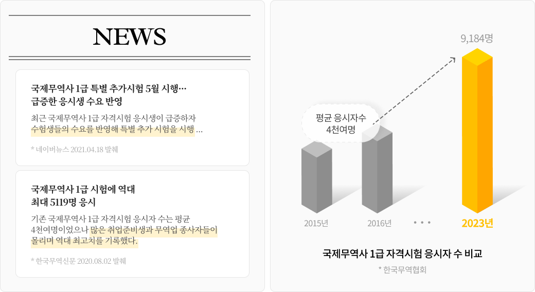 진학 · 취업 · 이직까지 국제무역사 자격증 하나로 경쟁력이 달라집니다.